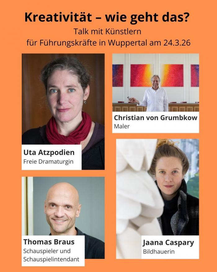 In einer Art Talkshow werden Künstler zu Wort kommen, die über ihre eigene Kreativität sprechen, über ihre Herangehensweise, Hindernisse, Fehler und Zufälle. Sie zeigen, wie resilient sie sind, welch intrinsische Motivation sie haben und was Führungskräfte von ihnen lernen können.